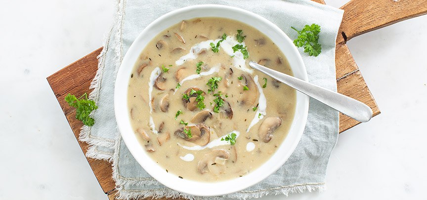 De overige champignonschijfjes even koken in wat water of licht bakker en toevoegen aan de soep.